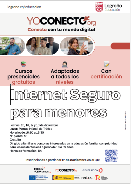 - El curso ‘Internet seguro para menores’, dirigido a personas de entre 18 y 59 años, tiene un componente práctico en el que los participantes “aprenderán haciendo”. Sus contenidos están basados en situaciones reales, priorizando el uso seguro y eficiente de herramientas digitales que responden a los desafíos actuales, como la protección de los menores en el entorno digital, el uso seguro de internet y las redes sociales, la privacidad y la protección de datos, la navegación responsable o los controles parentales.