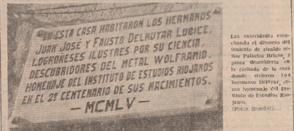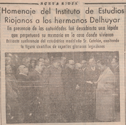 El Instituto de estudios riojanos homenajeó a los hermanos Delhuyar en el segundo centenario de sus nacimientos con una conferencia del catédrático madrileño Sr. Catalán y la colocación de una placa en una de las casas que habitaron en la calle Santiago.