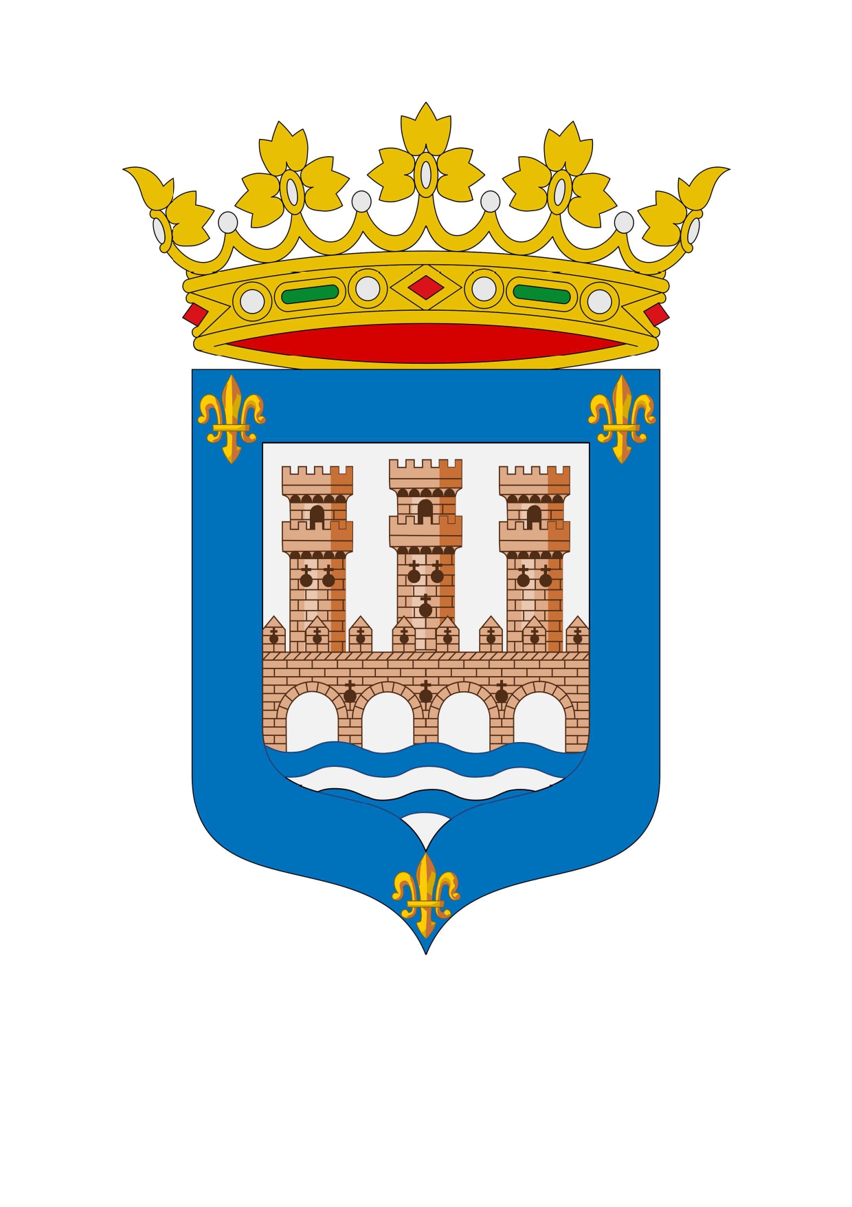 "Escudo de plata, con un puente defendido de cuatro arcos y tres torres, las de los extremos ligeramente más bajas que la central; todo de su color, mazonado y aclarado de sable y sobre ondas de azur y plata. Bordura de azur, con tres flores de lis de oro, dos en los cantones del jefe y una en punta".